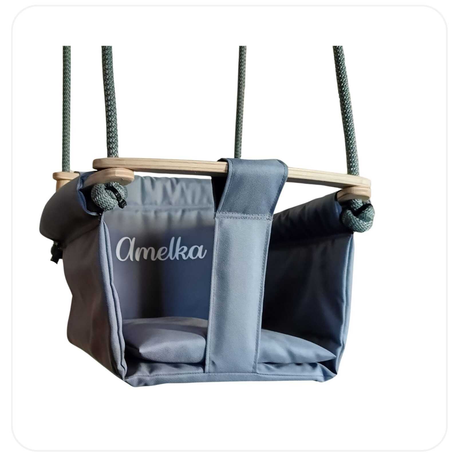 Huśtawka kubełkowa materiałowa z aplikacją np. imieniem dziecka.